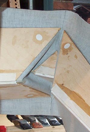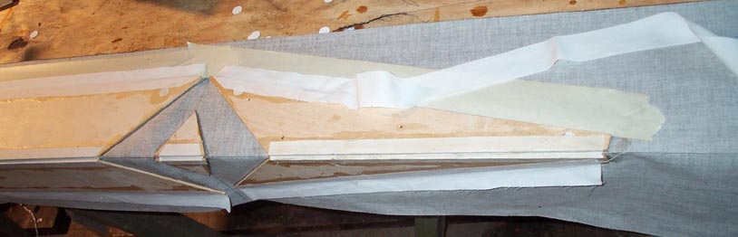 Finally, additional strips of muslin are glued to the edges of the gussets where they will be hinged to the feeder boards. These strips are not glued to the gusset edge at this time, but only to the inside face of the gusset; they serve as aids to correctly attach the cloth to the boards (see next chapter). So mask, and brush the glue away from the edges of the gussets, so glue will not get on these edges.