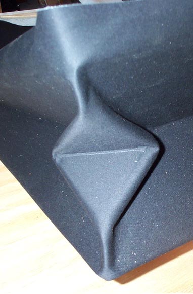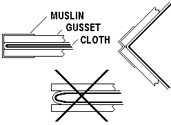 The muslin strip is first glued to one gusset; then the edges of the gussets; and finally to the other side gusset. It must be firmly glued to the edge of the gusset, so that a sharp fold line is maintained at the cloth as shown above.
