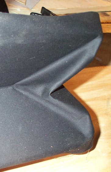 The two feeders in this later model organ are gusseted, but do not have traditional leather corners. Aeolian worked out a means to make a gusseted pressure feeder out of one piece of cloth, a configuration I have never seen before. The secret is two small triangular gussets in the center of each corner, which make the corner bulge out in an orderly way, without wrinkling. Since this arrangement is beyond description, I propped up one of the completed cloth assemblies, and photographed it before it went on to the feeder.