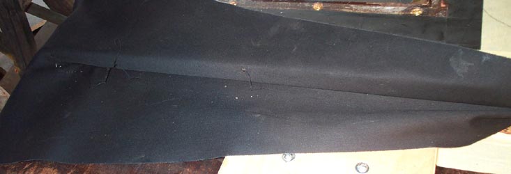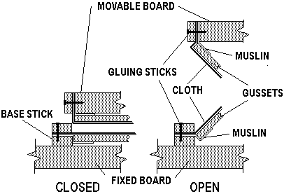 Now attach the cloth to the sides of the moving board the same way as the end. In player work, one always stretches the cloth along a line parallel to the edges of the boards. But in this case, the cloth is stretched towards the hinge end and also inwards, along the top of the board. The firmly attached gussets keep the cloth from being pulled crooked by doing this, and in fact it has to be stretched thus. This makes sure that the upper fold line is pulled snugly against the movable board. Hold the stretched cloth in place, and immediately nail on the sticks.