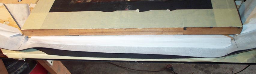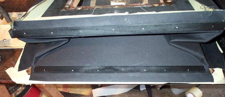 Insert the cloth assembly, and line it up. Attach it first to the movable board, on all three sides. One has to do this first. to be able to pull it tight around the corners. On the fixed board side, being surface mounted, this doesn't matter.