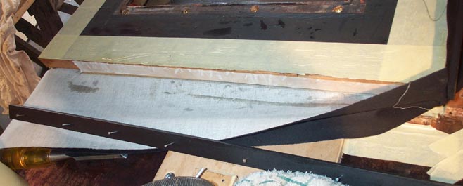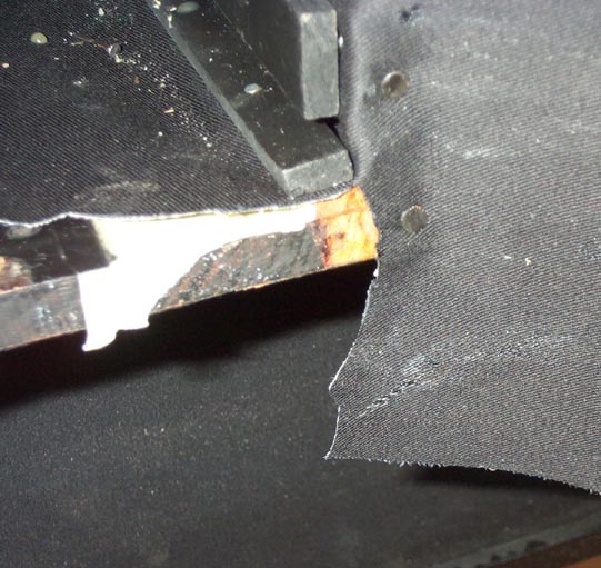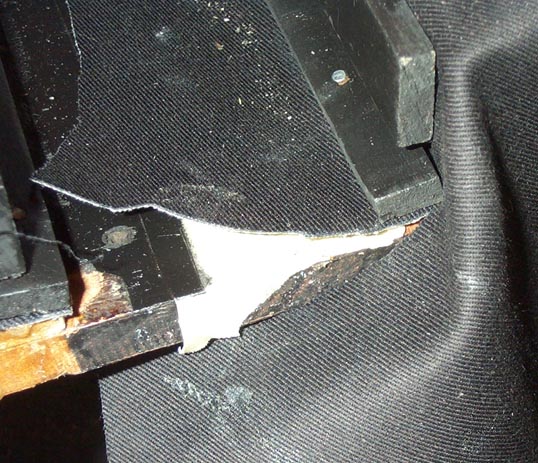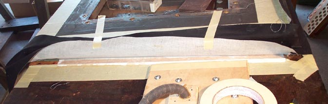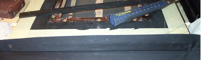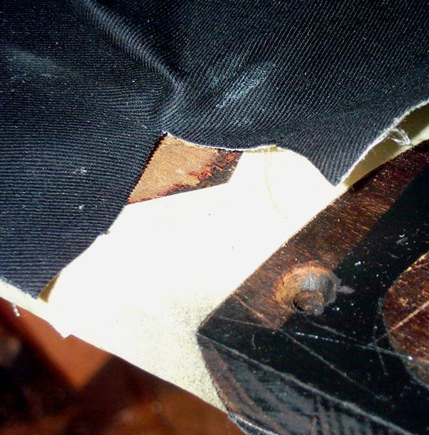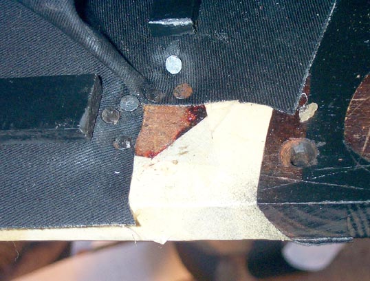 Now for another tricky bit. The corners of the cloth, where they were notched, are attached to the "floor" of the fixed board. Aeolian, normally stingy with tacks, used six for each corner. Two at an angle, in the center of the 45 deg. ramp on the ends of the fixed sticks. Two more as close to the end of the notch as possible. The cloth around the end of the cut will stretch enough that these tacks will seal the cloth around the end of the cut, leaving no leak. That's why one should make the corner cuts as far away from the turning point as possible. The last two tacks secure the outer corners of the notch.