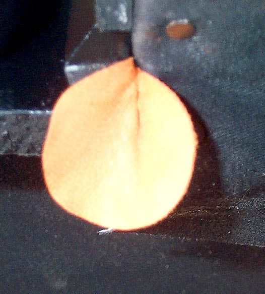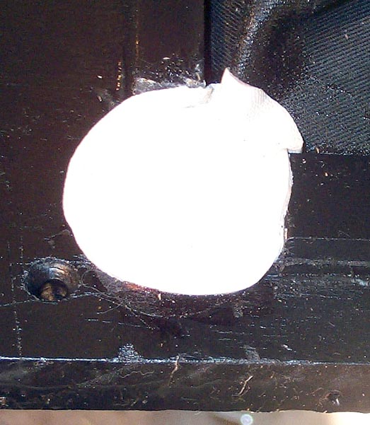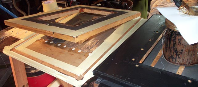 After the glue was well set, everything was trimmed. The cloth, and the circle shown below, was masked, and the entire feeder side of the bellows assembly was spray painted. Finally, replicating what Aeolian did, I put a seal patch over the "corner cut and tacks" arrangement at the two lower front corners, as extra insurance against a point leak at this continually flexing point. I used a circle of Cambretta, with the edges stretched into a "450 degree circle", making sure it was well tucked into the gaps between the sticks and the cloth, and touched either wood or cloth all around its rim.