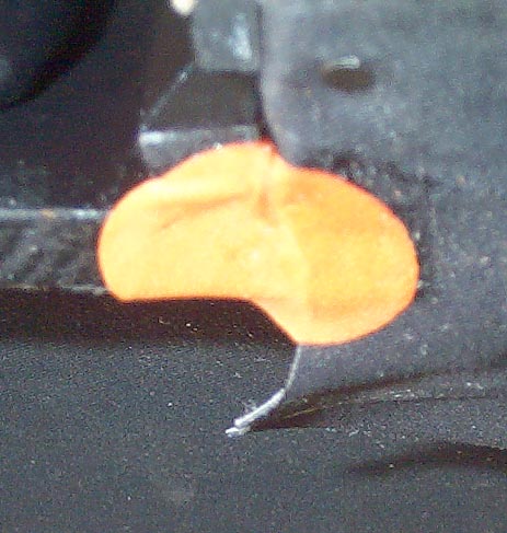 There is a potential leaker where the lap is cut to go around the corner. Aeolian did nothing with this, assuming that excess glue would fill in this never-flexing point, but just in case... I took a small pouch and stretched the edges to make a "540 degree" circle out of it. It was folded in half, and one corner was pushed down into the gap with the back of a knife. When this set, the remainder of the pouch was stretched over the hinge face. Then the hinge line cover strip was glued on, as shown in the reservoir pictures.