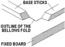Now here is where the muslin strips attached to the edges of the gussets in the last chapter come into play. They help to define the fold point where the cloth joins the bellows boards, Note that the two boards are configured differently. On the movable board, where the gluing stick is on the side of the board, the fold point is next to that board. But on the fixed board, the gluing stick is oriented horizontally, the hinge point is on the outside face of the cloth, with the gusset positioned below the plane of the fold, in a "well" created by the elevated strips permanently attached to the board. If the fold was as on the movable board, the edge of the gusset would hit the gluing stick when the bellows were opened.