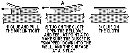 After all three sides of the cloth are glued to the movable board, then begin to attach the bottom edges, starting with the front. This proceeds differently. In the case of the bottom edges, the muslin is glued and pulled tight so as to pull the gusset outwards till it hits the inside of the fixed sticks, but remains inside the "well", below the upper surface of the fixed sticks. Sometimes the cloth is stubborn, and the gusset will want to stay on top of the fixed sticks, and not snap into the well. If this happens, opening the bellows will relieve the pressure on the gusset, and it will be able to be pushed right down.