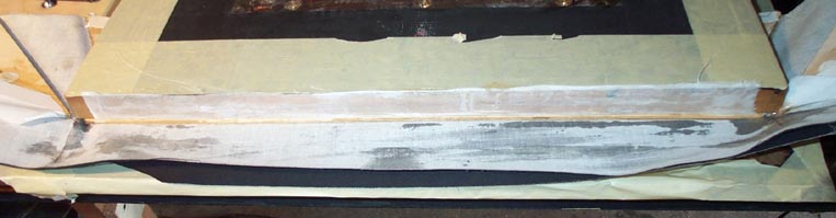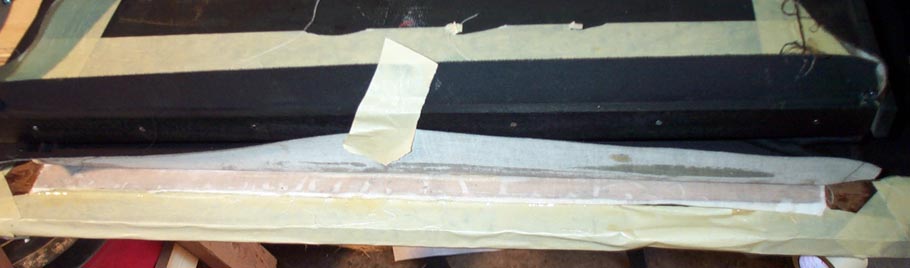 While this is setting, prepare the gluing stick by starting the nails into it. Then apply a heavy run of glue to the cloth and the already attached muslin, and pull up the cloth, and hold it temporarily with tacks; pull the cloth up really hard.