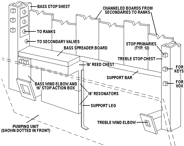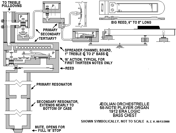 Here is how the bass reed chest works. For the lowest thirteen notes, the channels that normally control the rank pallet pulldown, are also directed to a row of pouches in the bass chest. These operate secondary-secondary valves. (Should these be called tertiary valves?) When these valves act, they vent large square pouches, which in turn, open pallets which admit wind to the huge bass reeds.