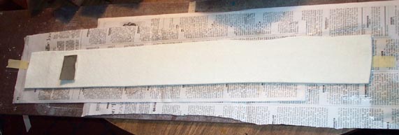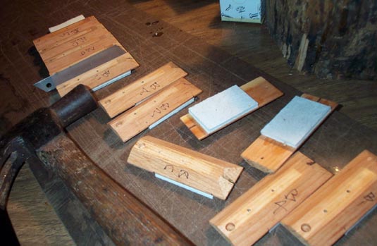 The pallet levers are removed, and the pallets are glued, edges touching, to the strip of valve composite. There is not much margin between the edges of the pallets and the seat holes, so it is essential that the pallets are cut apart very accurately, with the cut perfectly vertical, I discovered that it is much easier, and more precise, to cut the pallets apart by a Guillotine action, rather than a cut with a snap knife. A large, whole new snap knife blade is held vertically, between the pallets, and gently tapped with a hammer. This technique is quick and gives perfect results every time, and will be used later for the 348 rank chest pallets, which have an even narrower margin for error.