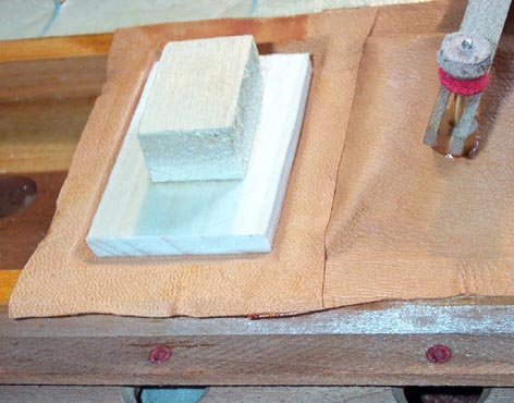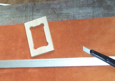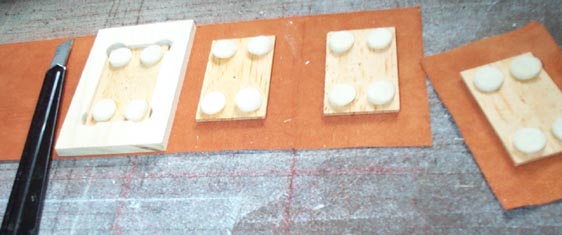The big square pouches have a wooden follower inside, which has to be exactly in the center of the pouch. To cut the pouches, and center the follower, I made a wooden template. Its outside dimensions are the size of the pouch plus 1/16" to allow for the dip, and a hole that just fits the follower is cut in the center. First cut a strip of pouch leather as wide as the template is long. Put the template on the strip, and set the follower, with the glue applied to its top surface, in the hole. Only a narrow strip of glue was used, around the center of the follower. Trim the pouch to width using the edge of the template. Then, holding the follower in place, lift the template and move it to the next place on the strip.