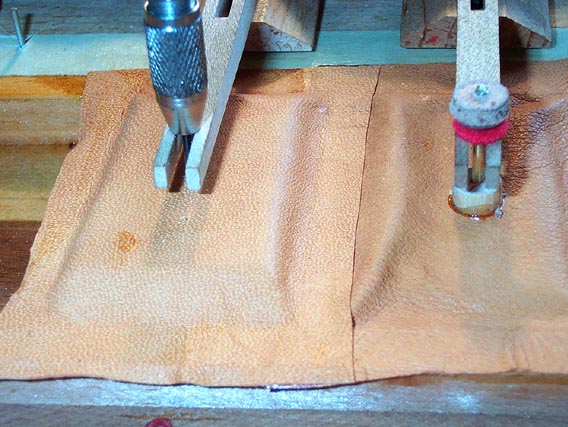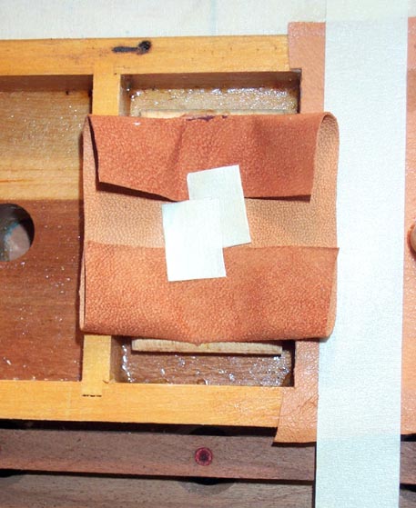 The pouches are glued to the wells, with the edge of one overlapping the previously laid one. Working one well at a time, trim off any of the previously laid pouch that extends over the edge of the well. Mask the flexible part of the previously laid pouch. The pouch being laid has its top and bottom held folded back with tiny bits of tape, so that one can see the follower. Apply glue all around the edges of the well, and quickly pull off the masking tape on the old pouch, so that excess glue on the tape does not get on any bit of the pouch that might overlap the previous pouch's flexible area. Drop the prepared pouch onto the well, using the visible corners of the follower to center the follower in the well. Press down the sides of the pouch; unhitch the little tapes, and press down all the edges of the pouch, pulling them tight without shifting the position of the follower. Finish by dipping the pouch with a bit of wood cut to the same size as the follower, and smoothing out the edges. The first picture just shows the centering process without glue. There was no way to do all the steps quickly enough, and take pictures too. Also note that this technique requires some development; I spoiled several pouches until I figured out how to lay them so the follower ended up in the center of the well.