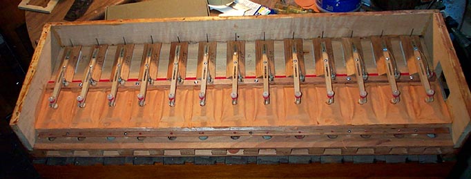 Here is the final result. The pallet springs are attached to a removable strip that is screwed on right over the upper margin of the pouches. Because of slight dimensional variation, each pallet is unique to its own position, so they are all numbered so they can go back in the right place if they ever have to be removed.