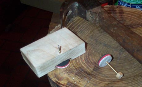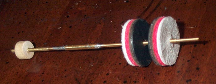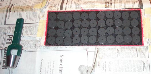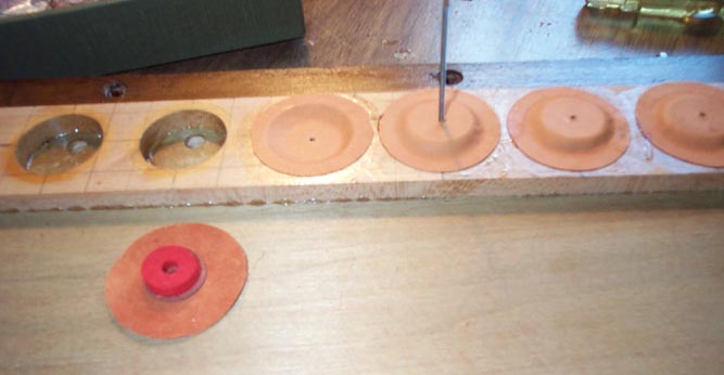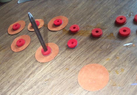 These valves are a composite of valve leather, either rather stiff brown felt or thick bushing cloth, cowhide to get a good grip on the stemwire threads, and a backing washer, 25/32" in diameter. Having no stiff brown felt, I used thick key bushing cloth. There is no 25/32" punch, but a 20 mm is just a few mills over, When the composite is dried, punch the discs out through all the layers, using the new backup washer as a guide. The the hole in the center is shear-punched with a flat ended steel wire on the boxwood punching block. The the hole is "tapped" with a stemwire.