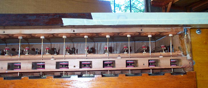With the spreader board (with the pouches) off, the valve discs are inserted into the cavity from the front, and speared with the stemwires inserted through the guide from the top. The wires are spun to screw the discs into their approximate position. Then the pouch board is attached and gradually lowered into place while the upper ends of the wires are screwed into the already glued on buttons. This takes a while, moving from valve to valve, but eventually the pouchboard can be firmly screwed down. Now, by turning the stemwire in its button, or by turning the valve discs with the fingertip, everything can be adjusted to the correct place. I have no idea of the correct valve gap, so I guessed for the time being. Later, the points of the wires will be clipped off, to allow the reeds (barely visible at the back) to be pulled.
