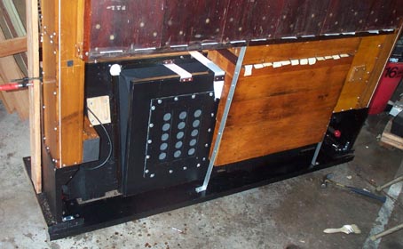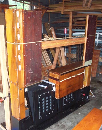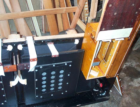 Now the wooden strip that supports the three treble end panels is installed, and the remaining four backplane panels are attached to it, or the bass chest top. A new center support leg is made. (This also holds up the bass chest resonator box, along with another short support leg shown at the right.)