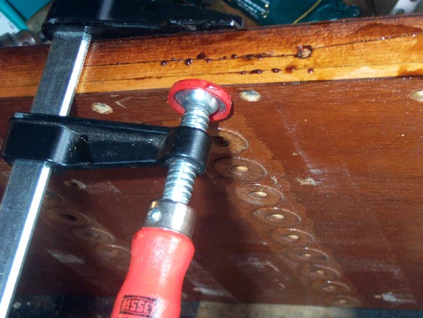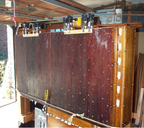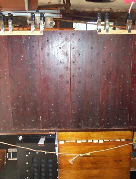 The six backplane panels are prepared for temporary installation. The vertical channels in them go all the way from end to end, and the open ends of the channels are covered with cloth, which was replaced. The lower ends of the channels for the first 13 bass notes, in the leftmost two boards, connect to the bass chest spreader board, so holes are punched in the cloth ends for these notes. One of the backplane panels was cracked on one edge, probably due to distortion of the whole case, when the organ was moved without all the components being firmly screwed together. This was mended with shellac and screws.