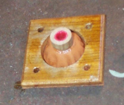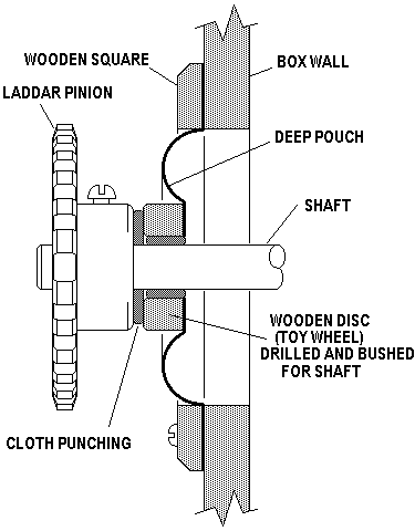 The very deeply drawn pouch's center can move laterally about 1/4" in any direction, to allow for any misalignment of the shaft and its box opening. Lay a big piece of pouch leather face down over a 3/4" high pile of coins, then push the glued wooden square down over this, to set the pouch. Smooth the wrinkles in the glued edge and trim; this lap of leather also serves as the gasket for the whole thing. The busing in the wooden center is very loose, so the shaft turns freely. The actual seal that keeps the wind in the box from escaping is a cloth punching. When the box is under pressure, the pouch inflates enough to press this punching against the hub of the sprocket, where the actual seal takes place.