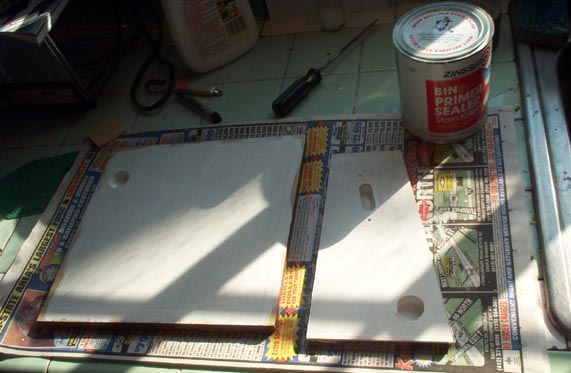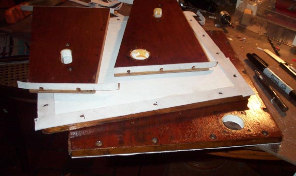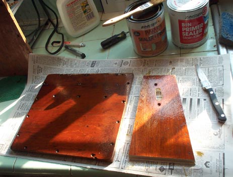 The six boards making up the box are made of 1/2" mahogany veneered poplar core furniture plywood. They had become water stained and delaminated in places. The veneer was glued back as well as possible, and the outside surfaces were given new coats of shellac. To seal any potential leaks through the porous mahogany to any poorly glued interface in the plywood, the entire interior was sealed with Zinsser B-I-N, (see Chapter 8.1), including all the holes where end grain showed.