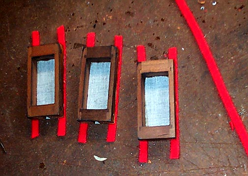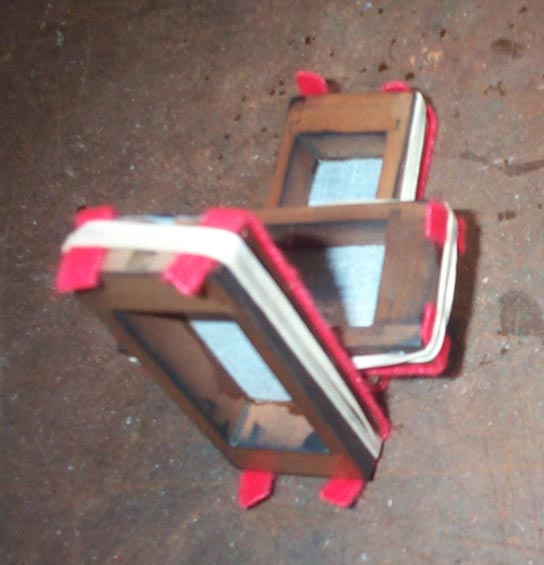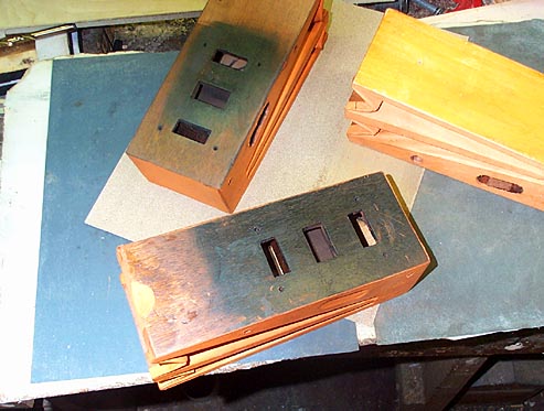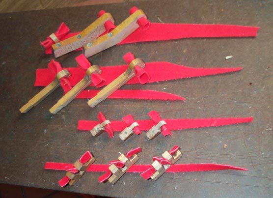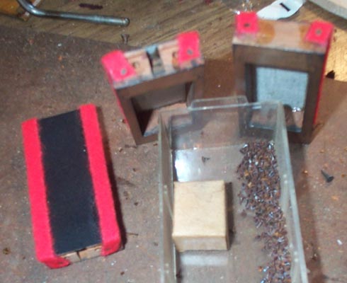 The valve "boxes" are recovered with new cloth, and a strip of bushing cloth is glued to each side. When the valves ride up and down in their guides, the wooden sides of the valves do not ride against the guides; the guides touch only the fuzzy edge of the cloth strips. So they are glued on with about 1/32" of the cloth protruding. Then the ends of the strips are lapped over and glued at an inward angle, to the ends of the valves. Finally these laps are secured with tiny tacks. I have often wondered if piano bridle tacks are the smallest mass produced steel artifacts made. A caster ladle of steel, about 25 minutes production in a modern steel mill, contains enough metal to make 1,664,000,000 of them.