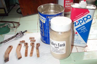 The mechanical parts have the old bushings drilled out. Since the thinnest modern bushing cloth is 0.041" thick, thicker than the original, the smaller holes are reamed out 1/64" larger than the original drilling. I wish someone still made 0.030" bushing cloth, as was used on many old players. The parts are cleaned up by saturating them with gasoline (lighter fluid) which dissolves the grease and grime, and then dusted with fuller's earth. This super absorbent draws out the solution of grease and solvent, leaving the wood almost as clean as new. Apart from aesthetics, this had to be done to remove oil that someone had put on the bushings in the past. Has any rebuilder actually ever found a roll motor that has not been oiled, in spite of the warnings against it, often posted right on the motor?