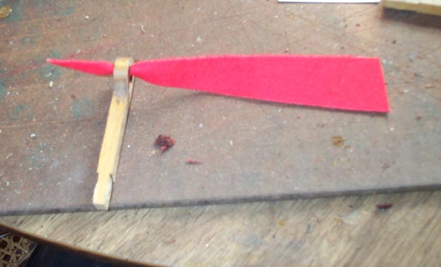 The rotating parts are rebushed. To measure the width to tear the cloth, make a long tapered piece. Pull it through the hole until it stops, and forms a proper cylindrical shape lining the hole. Mark the spot on the triangle where this happens, and use the marked triangle to nick the cloth at the correct width for tearing. This motor has five different size bushed holes!
