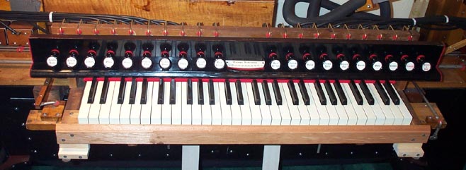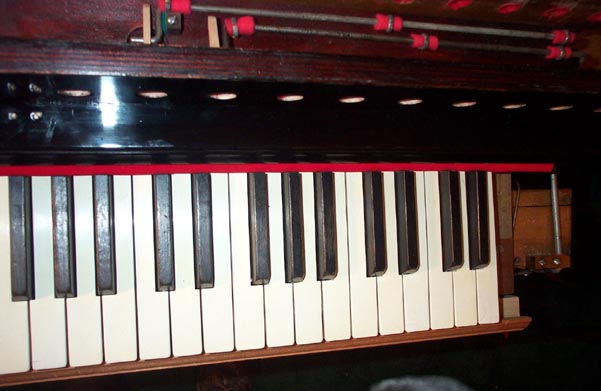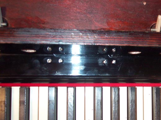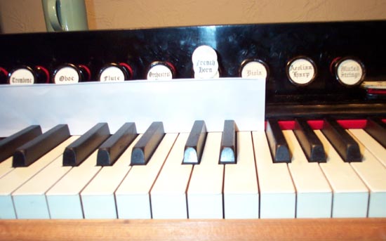 The printouts were glued to sheets of blank. permanent adhesive Avery label stock, using Spray Mount liberally applied to both surfaces and joined while still wet. Spray Mount used like this works like contact cement, forming a permanent bond that won't come undone, and won't curl the paper while drying. When this dried, the label texts were covered with transparent 2" packaging tape, forming a shiny and durable surface. The stop "stickers" were punched out using a 7/8" punch, guided by the printed circles. After the stops were finally installed with their guide wires, the old faces were cleaned with lighter fluid, and the new label stickers were applied. A piece of paper, accurately cut and folded to a 2" lap, secured under the keys, serves as a horizontal reference line, to help the labels go on straight. In a like manner, a new tempo indicator scale was made to replace the old one whose printing had partly come off. Don't complain about historical ethics here; all the old hot stamped celluloid labels are still there, under the stickers, in case anyone in the future can figure out how to make them look nice. I used a good quality sticky paper, but it will come off with lighter fluid, leaving no trace.