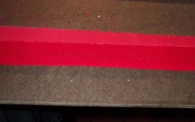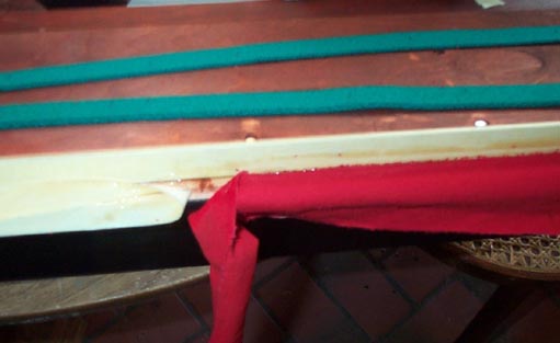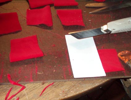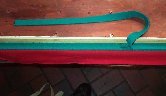 As an organ traditionalist, I like a nice chubby, soft rolled velvet bushing around the front holes in a stop board. Also, all my stock of felts and cloth was too light a shade of red to match the original. After several false starts, the following method was developed. First rip a strip of the correct color velvet from JoAnn Fabrics, about 3" wide. Mask all but the lower 3/8" of the back of the strip with a piece of paper, and spray on a heavy coat of Spray Mount adhesive. While this is still wet, turn over the sprayed edge half way. Since the adhesive does not go all the way to the fold line, the hem formed is hollow and flexible at the edge. This is cut to the correct width, and the cut edges are dipped into a pool of Spray Mount to prevent fraying. Make a bunch of extras; a lot are spoiled during the installation.
