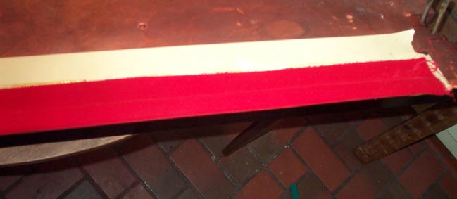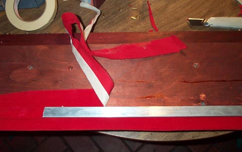 Remove the guide bar and mask about 1-5/8" behind the front edge of the strips. Lap the free edge of the velvet up and over, and glue it to the board, forming the "roll". Work a little at a time, carefully pulling the velvet just tight enough to form a nice rounded and even :"hem". When that is set, trim along the edge of the masking tape, and pull of the tape, along with the excess cloth and glue.