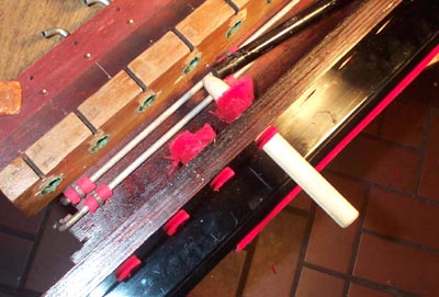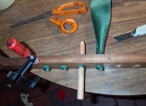 To insert them into the holes, first tape the back edge of the piece to a stop rod with Scotch tape. Being only one layer thick, this will go through the hole easily. Loop the end of the tape so it is easily grasped and can be pulled off easily. With a small brush, paint hot glue all around the first joint of your little finger, and roll your finger around the insides of the hole. Wipe away any glue that might have got on the front of the board with the thumb; it won't stick to the waxed surface of the board. quickly insert the stop rod part way, and check from below that the gap in the bushing is at the bottom center. Then push the rod in further, until about 3/16" of the hem is showing