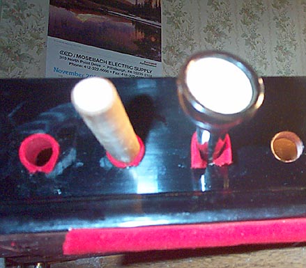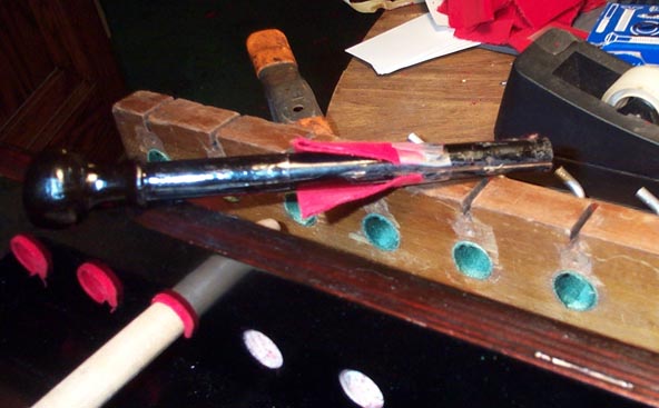 The thin layer of glue sets quickly, so one must work quickly. Reach it behind the board, and pull off the tape. Insert the stick, and using it to keep the whole bushing from being pulled out, gently but firmly tug any part of the cloth from behind while the glue is still soft, to get the hem protruding equally all around. Usually the lower corners have to be pulled in a little. Finish by wobbling the stick around in the hole, to force the cloth against all sides. It doesn't matter that there is a v-shaped gap in the bottom of the bushing; it can't be seen when the stop rod is in place.
