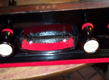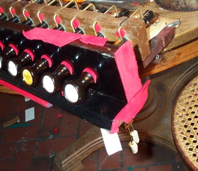 The tempo indicator guide block, and the ends of the stopboards, are trimmed with red velvet, glued with Spray Mount and folded. To make it possible to turn the trim roll around a sharp corner, don't just notch the strip 45°; punch a 3/16" hole about 1/16" away from the turned edge, then make 45° cuts up to the edges of this hole. The little bit of hem above the punched hole will then turn sharply around the corner without bulging. Actually, bushing the edges of the stop board is an utter fake here. Stop board edges in pipe organs are traditionally bushed, so that the cheeks of the organ will not be scratched when the stop board is folded up for maintenance. But this stop board doesn't fold up. Of course, the stop boards in Aeolian pipe organs don't fold up either, but they are bushed too; I guess tradition governed here.