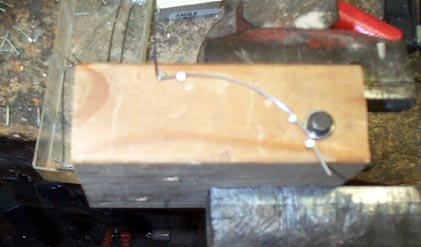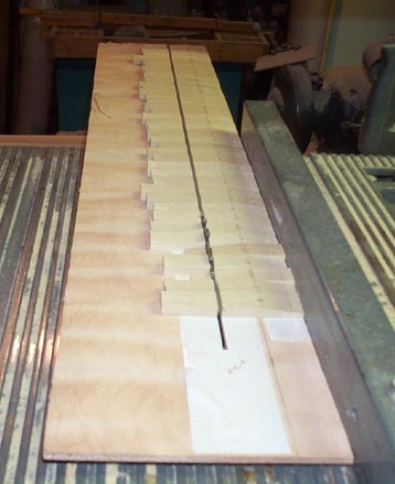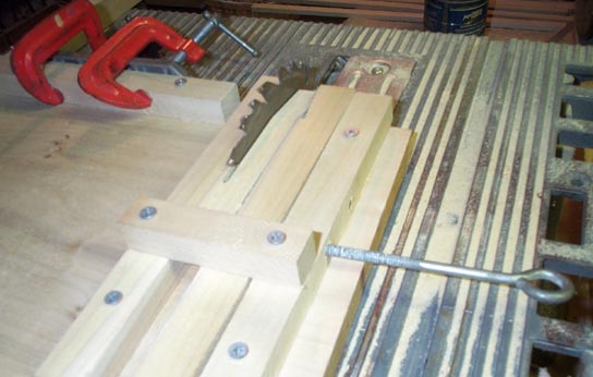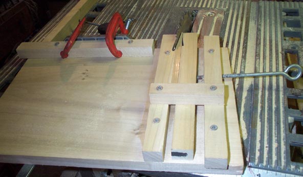 The stop pallets are exposed, right out in front, so they were fair game for my old friend, the organ mender who thought that thick, clear car door hinge grease could cure everything. Also, they had been releathered with gusset sheepskin, stuck on with white glue. Please, dear reader, if you don't believe me, heed the words of the world renowned rebuilders Art Reblitz, Craig Brougher, D. L. Bullock, and many others too numerous to mention: DON'T LET ANYTHING BUT HOT HIDE GLUE TOUCH ANY PLACE IN A RESTORATION THAT MAY EVER HAVE TO BE REDONE IN THE FUTURE! It took forever to soak the white glue soft enough to scrape it off in tiny bits, without taking wood off the surface. If hot glue had been used, only a moment's washing would have taken off the replacement leather, leaving the surfaces perfect when they dried. Only to discover that he had apparently sanded off the original leather, leaving the two seating surfaces slightly bowed. so they would not rock evenly or reliably seal the pneumatic holes. Also, two of the originals had been replaced with roughly whittled replacements. So I decided to make all new ones. First the edge of a poplar board was scored with a vee-shaped groove, using a tool made from three pieces of wood that slid, clamp fashion, along the edge of the stock. This tool had a #10 machine screw, ground to a flattened point, through the middle board. As the tool was dragged along the board edge, the point of the screw scraped the spring groove in the center of the board edge. The board was then ripped into strips thicker than the final pallet dimension, and cut into oversized blank sticks. A rig was made to safely cut the shallow angled face of the stick, and then was used straight, to trim the flat face of the stick to the final 5/16" thickness. By making both seating surfaces on the same rig, they both ended up on the same plane, so the pallet would rock squarely. The same rig (not shown) was finally used to trim the edges of the sticks to the final 5/8" pallet width. Trimming only a little bit of wood with the carbide blade, and the work piece firmly held, produced a surface smooth enough to be used without much sanding, with very fine paper glued with Spray Mount to a very flat Formica table top.