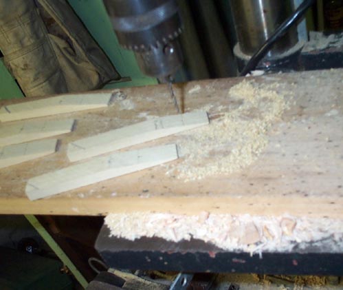 The 9/64" center "rocker" pin hole was drilled only part way through, and a 3/32" hole was drilled all the way through near the end, to form the inner end of the guide pin slot. Later that slot was cut by hand with a snapknife, from the end of the stick to the guide hole. To accurately center these holes, a 5/8" Forstner bit was pinched over the sticks, and tapped so that its point served as a center punch. The sticks were cut to the final length all at once by sticking the sticks onto a scrap of plywood with carpet tape, and sawing through the whole thing. Note that there are a few sticks that appear to be backwards. One of the stops, the "Pneumatic to Manual" is a normally open valve, with the hole inboard of the rocking point, so the thick end of that pallet is opposite all the others.