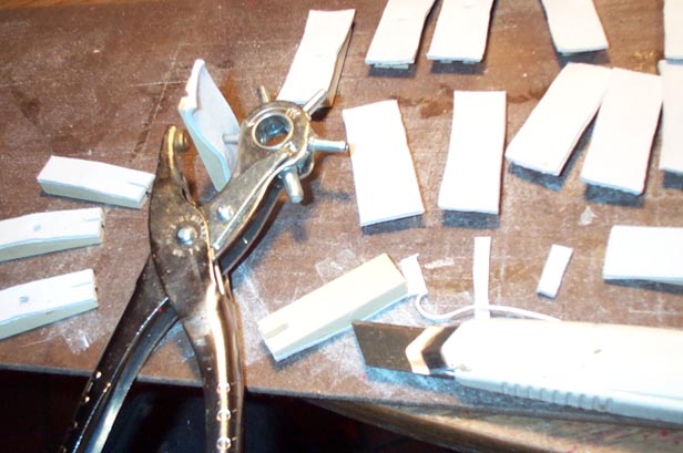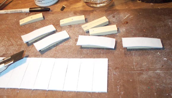 The pallets are releathered. To get reliable seating on the comparatively rough stop valve board, and assure good closure even with light spring pressure, Leather Supply House thick deerskin was selected. Since the glued surface is not flat, each piece of leather is stuck on individually. When dry, the pallets are trimmed, and the rear guide pin slot is cut out, holding the knife vertical. Thus the cut is slightly inwards from the edge of the slot, and the pin rides on a little fuzz of leather, rather than on the wooden guide slot edge, to prevent noise. The center rocking pin hole is punched right through the leather after assembly. This leaves the hole in the leather exactly concentric with the hole in the wood, and leaves a little burr of leather lining the hole. Otherwise the pallet makes a little clicking noise as it rocks around the center pin.