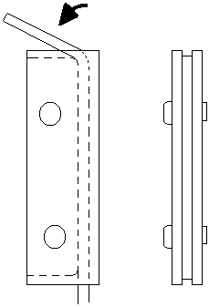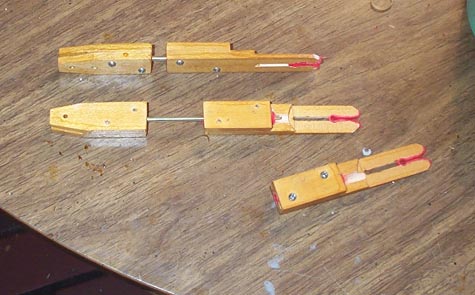 The original guide "staples" were rusted and pitted, and would not run smoothly in their grooves. New ones were made from 1/8" brass rod, McMaster-Carr item 8859K53, 10 one foot pieces to a bundle. These were first annealed by laying them across the big element in the electric stove, and leaving them on "high" until they had turned red, blue, and back to pale yellow. To make sure they all were the same size, perfectly straight in the middle, and had their legs all at the same angle, a bending rig was made, using an original staple as a guide. Two pieces of 3/4" aluminum bar, and one piece of 1/2", were riveted together as shown. The bar stock was clamped into the long groove in a vice, using another scrap of the rod in the groove to hold the stock in place. Then the ends were bent over with a hammer. The legs were clipped to length, and the tips slightly pointed with the belt sander. Two of the staples have one leg bent out, flattened, and drilled for a screw, rather than being driven into holes in the stop rod. These are for where the groove for the stop rod toggle would interfere with the staple leg.