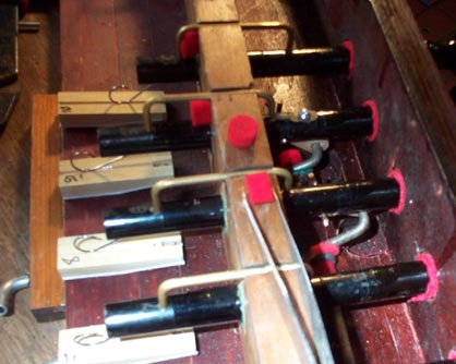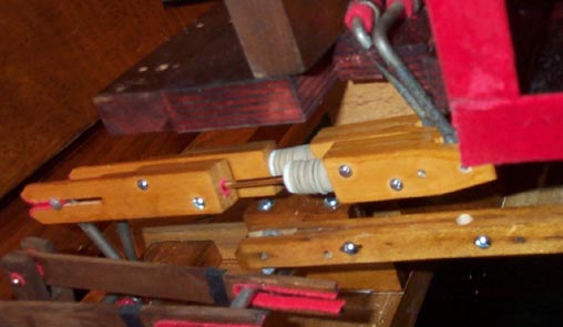 Now for the adjustment. The bending of the springs is very critical: too loose, and the pallets do not close reliably; too tight, and the stop binds and is hard to pull. Back when I was still trying to make the original pallets work, I tried graphite. But this did not work very well, and ended up making everything dirty, so I had to clean everything up and start over. There is something I discovered that will make the stop action smoother and lighter. The shafts of the stop rods were rough and scored, and didn't move smoothly in the bushings. Refinishing the rods struck me as a difficult and questionable enterprise, so instead I covered the front two inches and the back two inches of the rods, where they go through the bushings, with shiny transparent 2" packaging tape. The spring keeps the rod pushed up against the upper halves of the bushings, so only the top three quarters of the rods have to be taped. Impure, you say, but it floats the boat. This makes a 100% improvement in the ease with which a stop can be pulled at any given spring pressure. The guide staples have very little clearance in their grooves, and can bind, so some of the staple legs have to be bent slightly so that the staple crossbar is exactly parallel to the stop shaft.