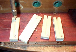 The valves are aligned on the centerlines, and new holes for the guide pins are bored with a bit of pointed wire in a pin vice. Piano center pins make perfect stem guides. A scrap of wood with a 1/16" hole makes sure that the new pins are driven in vertically, all to the same depth. Because of variations in my hand honed pallets, they are not interchangeable, so they are numbered where they go.