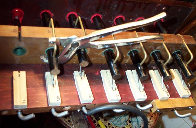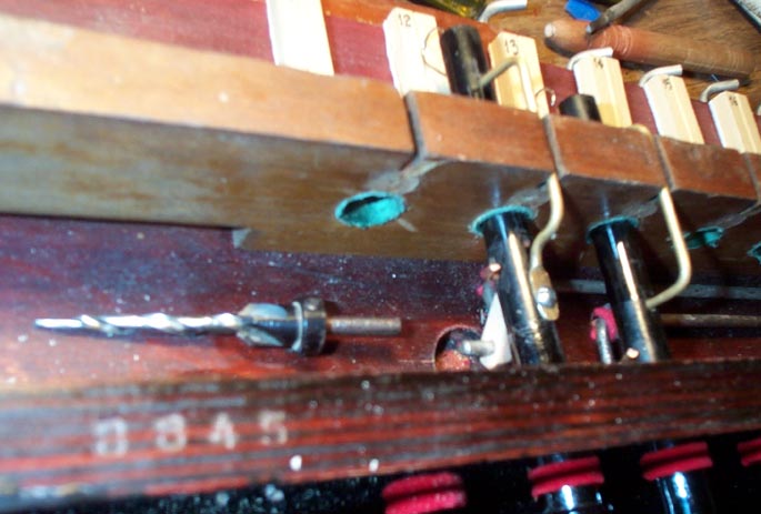 For the mechanical stops, the new toggle links were installed and adjusted for smooth action. A tapered drill, made for starting screws, is far better than a common reamer, to adjust the diameter of little holes so they fit just so. Reed organ people will appreciate the difficulties involved with getting the pins through the stop rods, to match up with the little holes in the small ends of the toggle links.