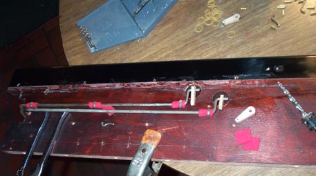 When the stop is pulled, the motion is limited by a pad of the thickest soft red felt. This has to be put on by applying a tiny drop of glue to the pad, not the board, and placing them with a tweezers. Not a bit of glue can be allowed to get on the bushing or the stop rod. Similar pads are put on the front of the rear board, to limit the closure of the stops. Due to variations, (probably my fault) different combinations of thin, medium, and thick name board felt, and medium soft red felt, had to be used to make the stops all look like they were closed to the same extent.