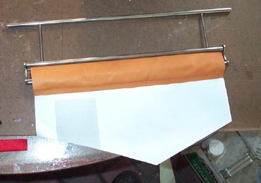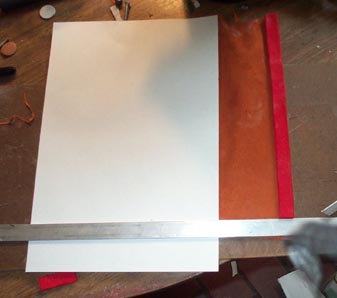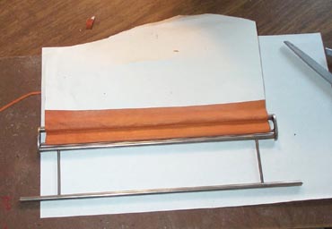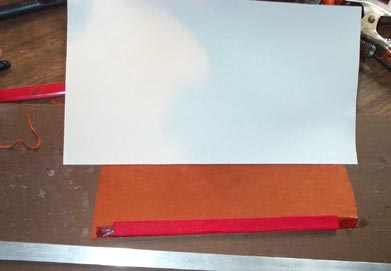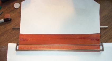 The whole thing was trimmed to width, and a pointed "leader" was cut in the paper. Now this point can be threaded through the narrow gaps between the bars, and the leather pulled tight and even by tugging the paper.