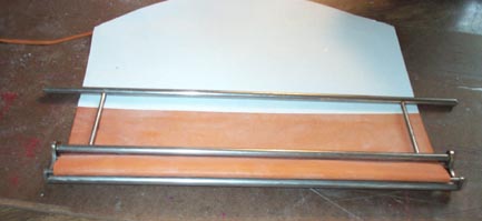 A good piece of pouch leather was stuck down very flat, on a fresh cutting board, made sticky with Spray Mount. One edge of the leather was trimmed in a straight line, and all but 1/2" at the edge was masked off, and the felt strip was hot glued here. A piece of aluminum bar kept the felt straight for gluing. Now keeping the leather flat and clean as the strip was threaded around the bars proved to be a problem. But this worked for me. On the opposite edge of the leather strip (cut wider than it will end up being), a sheet of paper was stuck on with Spray Mount.