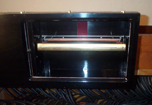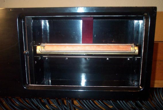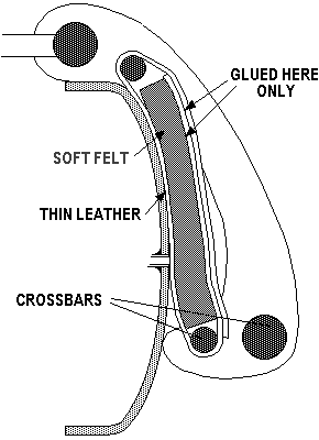 The "flipper" that covers the tracker bar when the player is not in use, is important. When the primary circuit is "inflated" by the valve in the manual touchbox, the path to atmosphere through the still connected tracker bar port, must be closed. I once thought that the spool box was always pressurized when ever the door was closed, and the pressure would push the flipper leather against the tracker bar. But Kevin McElhone corrected me; when the organ is turned to "Pneumatic to Manual" (which turns on the keyboard, and shifts the transmission to reroll) a valve linkage, missing on my organ, shuts off the wind to the spoolbox. Therefore, the flipper must be designed to block the tracker bar ports by its own weight and shape. The drawing shows the cross section of the flipper, with the thickness of the leather exaggerated for clarity. The flipper consists of a frame that swings forward and down, and four crossbars. An arrangement of felt and leather is stretched between the two smaller crossbars, such that the felt is curved just enough to push the leather against the tracker ports, by the weight of the frame alone.