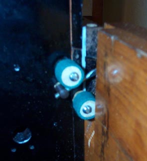 Where the hinge bar comes out of the box on the right side, there must have been some sort of linkage; a little lever arm is screwed in there. I have no idea what it was for. But there should be a way to adjust how far forward the assembly can go, to optimize the angle at which the flipper rests over the bar. An eccentric was made out of 5/8" dowel and action cloth. By turning the eccentric, the movement of the link lever can be limited as required to set the forward movement of the bar. Another eccentric is installed, to pad the rearward movement, so that the levers don't bang against the rear of the spoolbox when folded back.