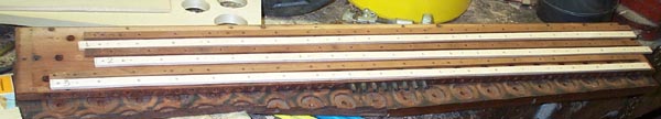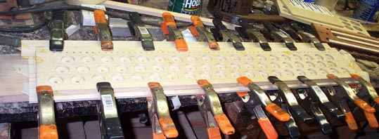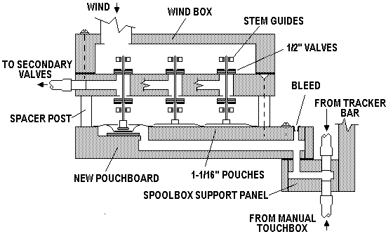 In my organ, the primary valves had been removed, in an attempt to make the instrument "single action", with the key pallets directly actuating the secondary pouches, as was done in earlier instruments. Since my secondary valves are of the type normally actuated by primaries, I elected to restore the organ to its original configuration. With the organ, I was given a spare primary assembly of the correct type, but it had been stored in such a way that the pouch board had become cracked and warped, requiring me to make a new one. Fortunately the valve board and wind box were intact, although the outside stem guide strips on the bottom were also cracked and split.