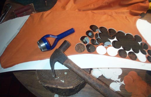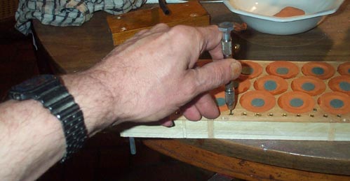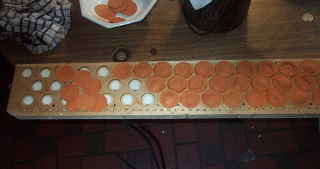1-1/2" pouches were punched from thinnest pouch leather. I find that it is much easier to punch out pouches, if the leather is stretched flat and stapled around the edges, to a piece of blotting paper. Punching through both the leather and the paper makes the cut cleaner; the pouches come out rounder, and they can easily be spaced close together to save money. The pouches were laid with hot glue, just dripped on around the well with a small brush, and then spread in a circular motion with the finger. Only a thin film of glue is necessary to hold down pouches, and this method keeps the glue off the sides of the well. If the film of glue is shiny, but not smooth like a pool of liquid, it is correct. The pouches were set with a tool made from a 1-1/2" valve disk, with a 3/4" punching of pallet felt on one side, and a drawer knob screwed to the other side. This pressed the pouch firmly and concentrically into the well. Between each pouch setting, go back three pouches and blow hard into the channel with a rubber tube and 7/32" nipple. This inflates the pouch upward, pulling it away from any adhesion to the pouch well wall, and checks that the rim of the pouch is firmly glued to the board face.