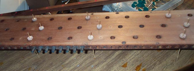 New lower stem guide strips were made, using the matching upper strips as a drilling template. Of course this wiped out the cloth bushings in the old strip, but they were half gone anyway. Then the holes in the upper strip were whiffed out 1/64", and the lower holes were increased by 1/32", to allow for thicker, modern cloth, and for the fact that the stem wires are stepped, with the upper end of a smaller diameter than the wire body. Then all the strips were rebushed in the usual manner.