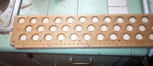 I used one piece of 1/2" poplar drilled for the pouch wells as the top. The old pouchboard served as a drilling template. Another piece of 1/4" poplar was channeled with saw cuts. These pieces were glued together with Yellow Carpenter's glue, and additional coats of Yellow were liberally slopped into the channels to seal the end grain segments between the channels. A third piece of 1/4" poplar was glued on to form the bottom. Then the assembled composite was sawn to size, and a strip of 1/4" glued to one edge to seal the open ends of the channel cuts. When this was all well dried, the pouch-to-channel hole, and the 5/32" holes for the bleed, the 7/32" inlet holes, and the screw holes, were drilled. Again, the old pouchboard served as a drilling template.