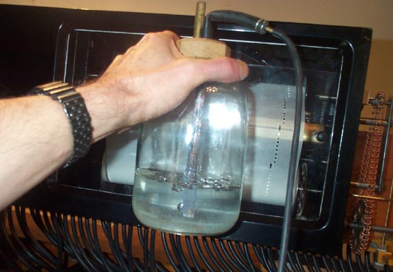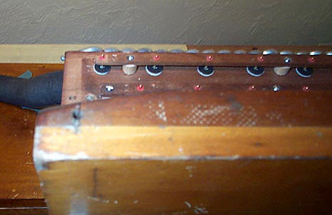 Then the wind box is installed and connected, and the test roll is run several times to "seat in" the valves. The bubble jar is connected to each primary output, and the note is played with both the keyboard and the test roll. A steady stream of bubbles shows that each valve is opening properly. Of course this can not reveal a leak if the valve is simmering, since any pressure caused by such a leak is dissipated through the partly opened lower seat. The only thing I could think of was to stick an ear tube into the array of valves from behind, and listen for leak around the lower seat. A few of these were found, so I had to take the wind box off and fix them. A this point, it was a matter of a few upper disks being very slightly crooked on the stems, rather than being in the wrong place. At 2.25 inWC, there is very little pneumatic force to flatten the valve disk against their seats, if they are not pretty flat to the board to start with.