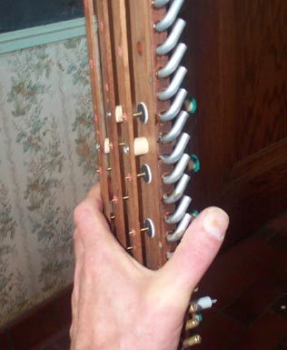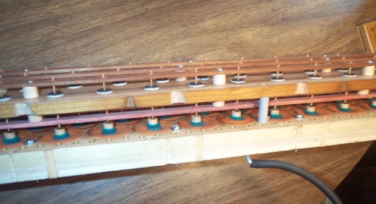 One end up with the two disks screwed to the wire, and flat to the board, with no gap. Now for the tedious part. Assemble the pouch board to the valve board. I had to make new spacer posts from McMaster-Carr 5/16" x 3/16" fiber tube, to replace the old ones that were lost. Using a mouth tube, test the action of each valve and adjust it individually. For quick response, the button must start as deep into the pouch dip as possible, but not so deep that the pouch at rest holds the upper valve away from its seat. Otherwise the valve will "simmer", like a badly adjusted player piano valve, and create a constant leak. I found that positioning the valve so that there was just barely a 1/16" space between the bottom of the follower pad, and the cardboard follower disk on the pouch, served this purpose. Then the lower seat was screwed down so as to leave a bare 1/16" valve gap when the valve lifts. The disks can be moved up or down on their stems by holding the stem from turning with a long nose pliers, and turning the disks by reaching in and tickling their edges with a small screwdriver. This takes a strong light, especially for the valves in the middle row. A a final test, the pouch is repeatedly inflated with the breath, and vented. A valve that works right will make a small but audible thwack as it both opens and closes. If the valve is too low, and resting partly on the empty pouch, it does not make a snappy sound as it closes.