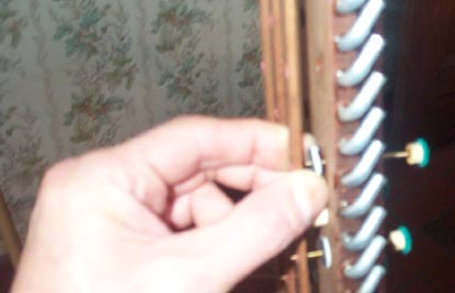 Not many pictures in this chapter, since many of the activities described take two hands. Assembling the valve disks and stemwires on the valve board took a while to master, but as usual, Aeolian had some clever ideas to make it easier. The reduced, smooth end of the stem wire easily stabs into the punched hole in the disk, and enables the threaded part of the wire to engage the disk with the valve flat against the board. First, working from the bottom, put a disk over the lower end of the hole, and stab in a stem. Holding the disk flat against the board, turn the button until the wire is partly threaded into the disk.